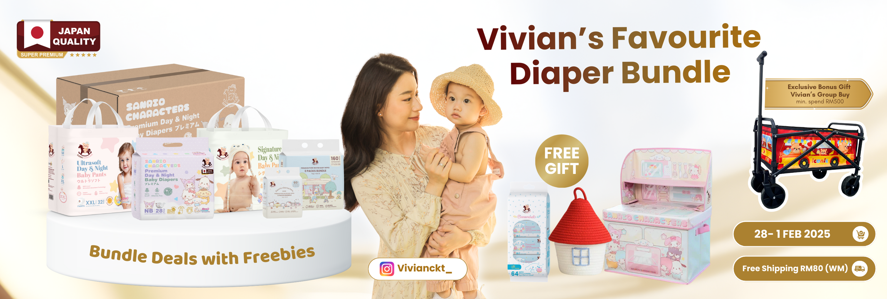 [Vivian's Bundle 2] Sanrio Premium Day & Night Baby Diapers Tape/Pants (S-XXL) & Baby Wipes